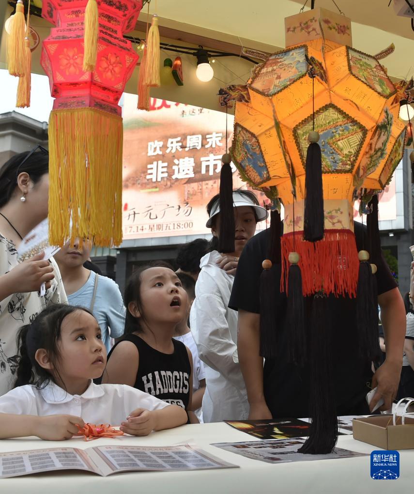 7月14日傍晚,小朋友在開(kāi)封市開(kāi)元廣場(chǎng)設立的“非遺市集”現場(chǎng)觀(guān)看傳統彩燈制作。