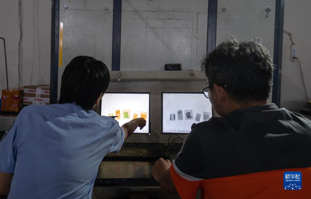 7月12日,尹銘燕(左)在芒市一處物流點(diǎn)對快遞包裹進(jìn)行查緝。