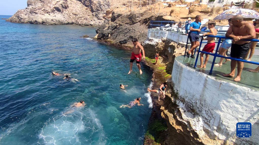 這是2022年7月21日,人們在阿爾及利亞第二大城市奧蘭的海濱休閑。