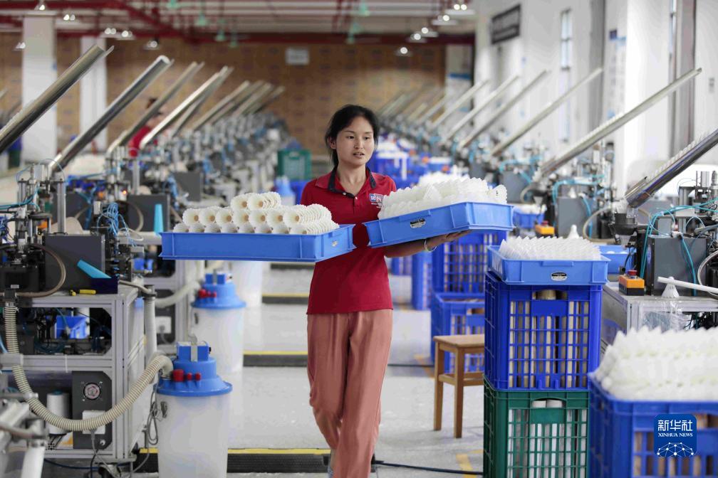 在貴州省錦屏經(jīng)濟開(kāi)發(fā)區一家體育用品公司羽毛球生產(chǎn)基地,工人搬運羽毛球(6月15日攝)。