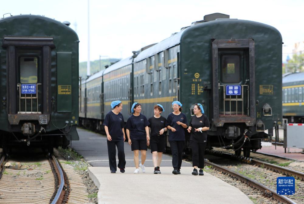 在牡丹江客運段,洗滌二班部分班組成員走在下班路上(7月19日攝)。