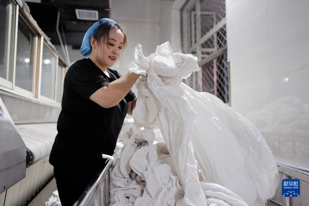 在牡丹江客運段牡(牡丹江)整備車(chē)間,洗滌二班班組長(cháng)李濱整理清洗后的列車(chē)臥具備品(7月19日攝)。