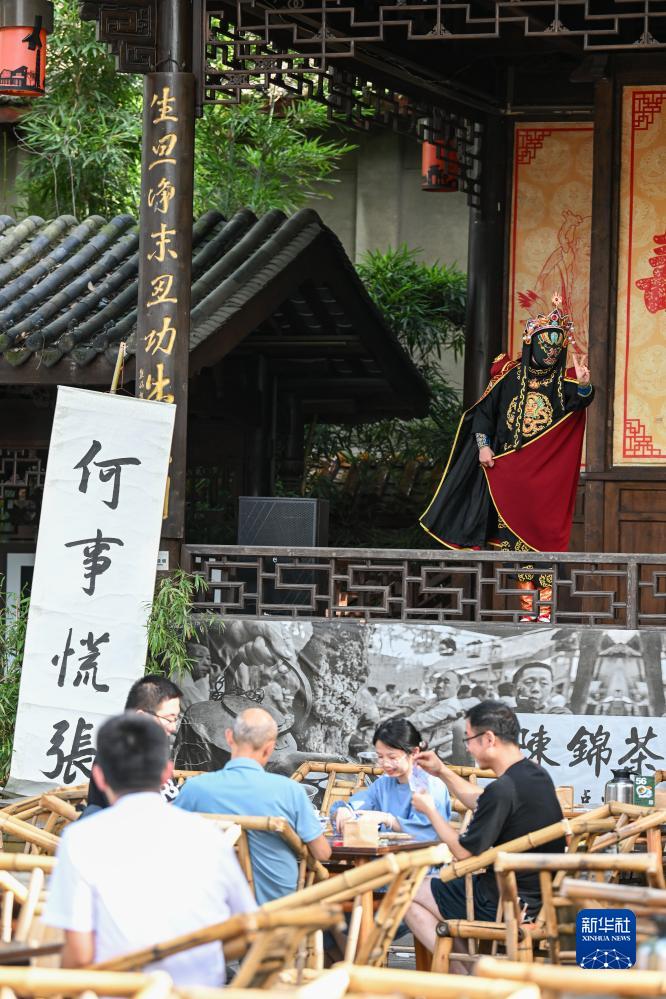 7月14日,游客在四川成都高新區的鐵像寺水街體驗蓋碗茶,戲臺上一位川劇演員正在表演變臉。