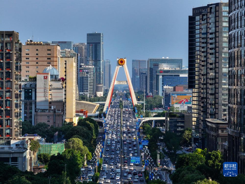 這是6月5日拍攝的位于四川成都人民南路上的人南立交橋,立交橋頂上筑有太陽(yáng)神鳥(niǎo)金飾圖案。