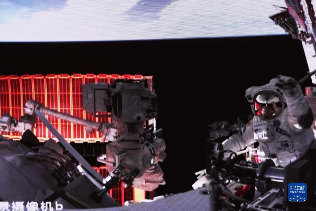 這是在北京航天飛行控制中心拍攝的神舟十六號航天員景海鵬成功出艙后揮手致意的畫(huà)面(7月20日攝)。