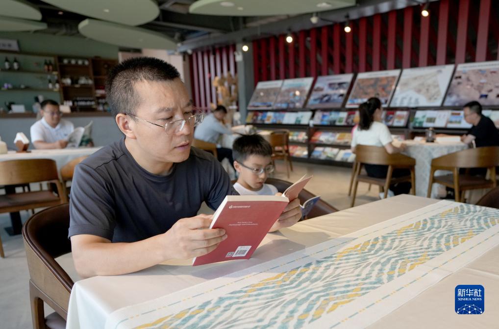 7月20日,來(lái)自四川成都的游客張青山與兒子一起在位于寧夏中衛市騰格里沙漠大漠星河度假區的沙漠圖書(shū)館看書(shū)。