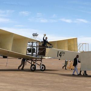 7月20日,在巴西首都巴西利亞舉行的杜蒙特誕辰150周年紀念儀式上,演員扮作飛行先驅桑托斯·杜蒙特站在“14bis”飛行器的復制模型上。
