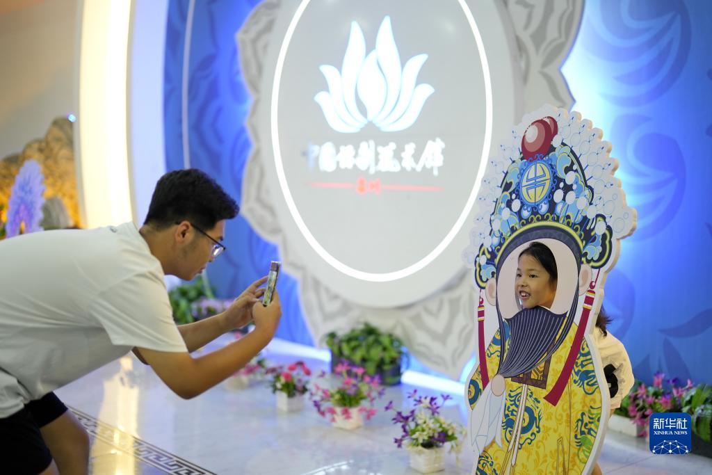 7月21日,在位于河北省灤州市的中國評劇藝術(shù)館,家長(cháng)在給孩子拍照。
