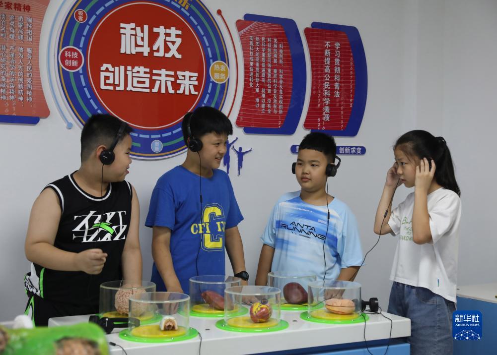 7月21日,幾名小學(xué)生在山東省樂(lè )陵市市中街道南鑫社區新時(shí)代文明實(shí)踐站科普館接受科普教育。