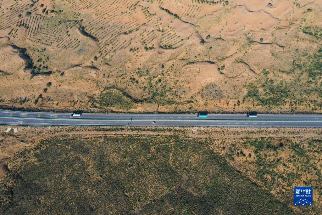 夏日時(shí)節,內蒙古自治區杭錦旗境內的穿沙公路綠意盎然,綠色沿著(zhù)道路前行,并向兩旁的沙地鋪展,猶如一條條“綠色動(dòng)脈”在庫布其沙漠中綿延。