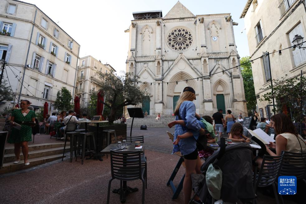 7月17日,人們在法國蒙彼利埃的圣羅克教堂前用餐。