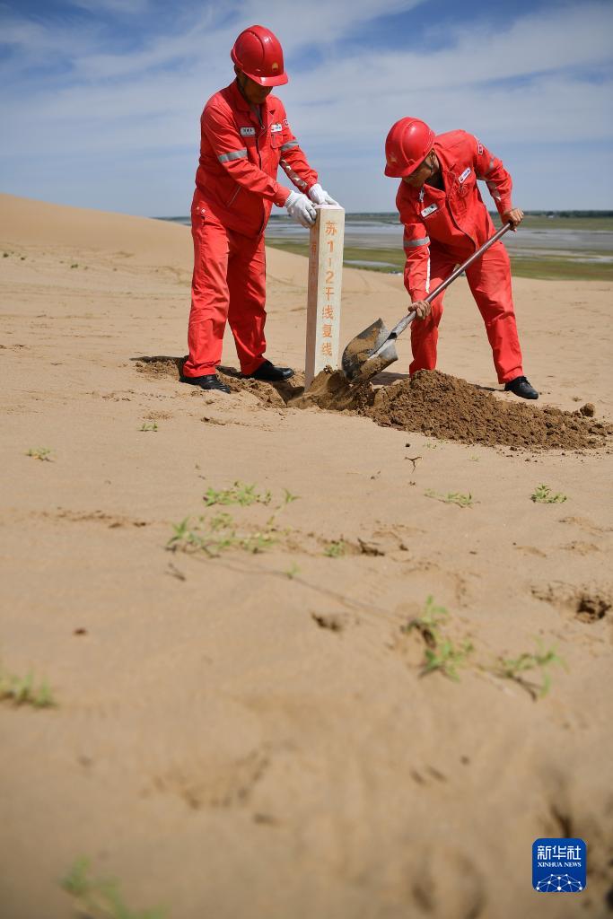 巡線(xiàn)隊員在巡線(xiàn)時(shí)重新栽埋傾斜的標志樁(7月23日攝)。