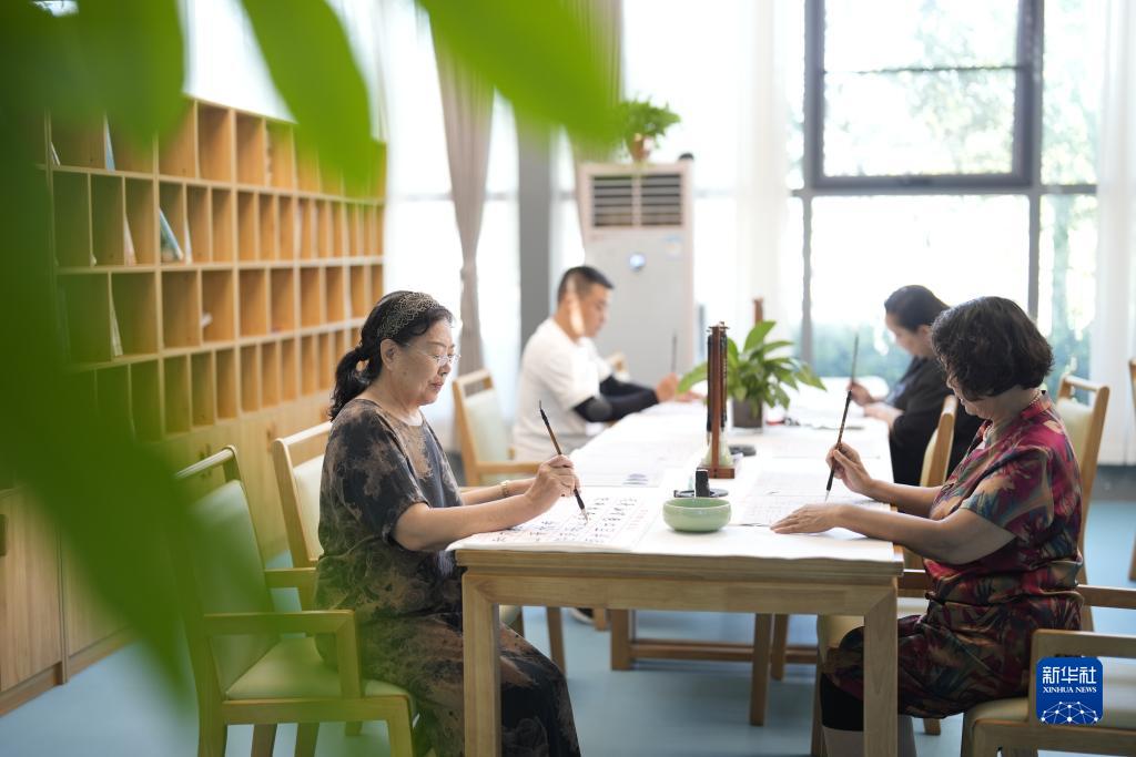 7月25日,老年人在河北省唐山市路北區橡樹(shù)灣社區養老服務(wù)中心練習書(shū)法。
