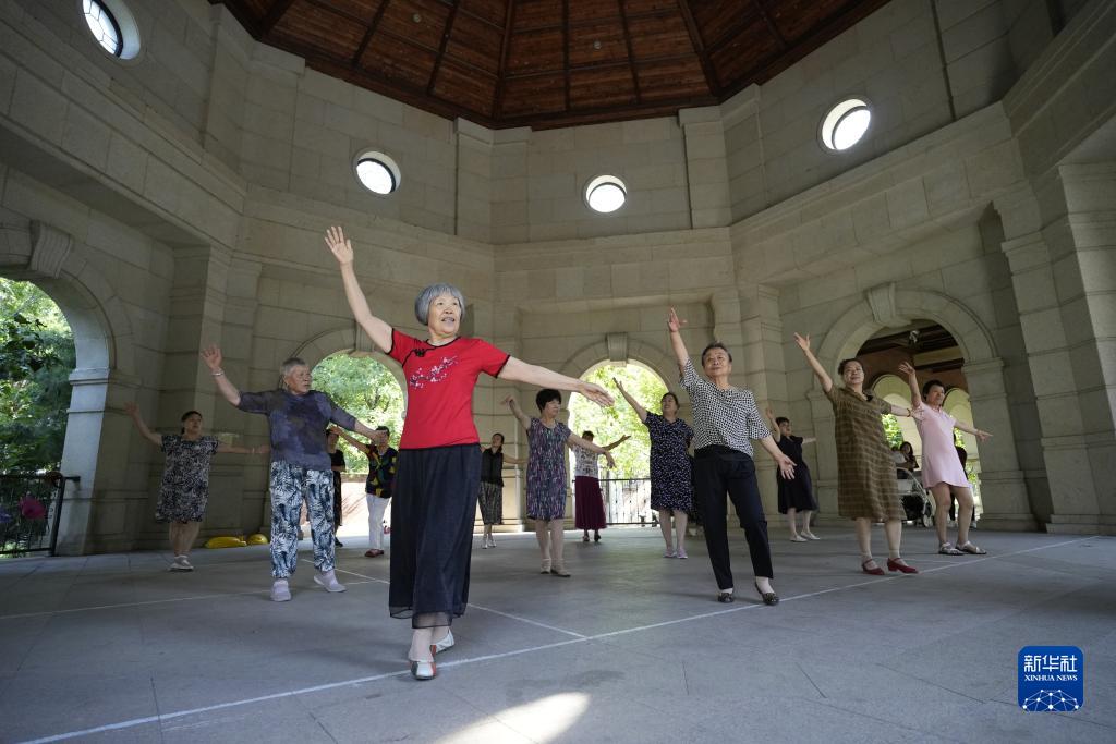 7月25日,老年人在河北省唐山市路北區橡樹(shù)灣社區養老服務(wù)中心練習跳舞。