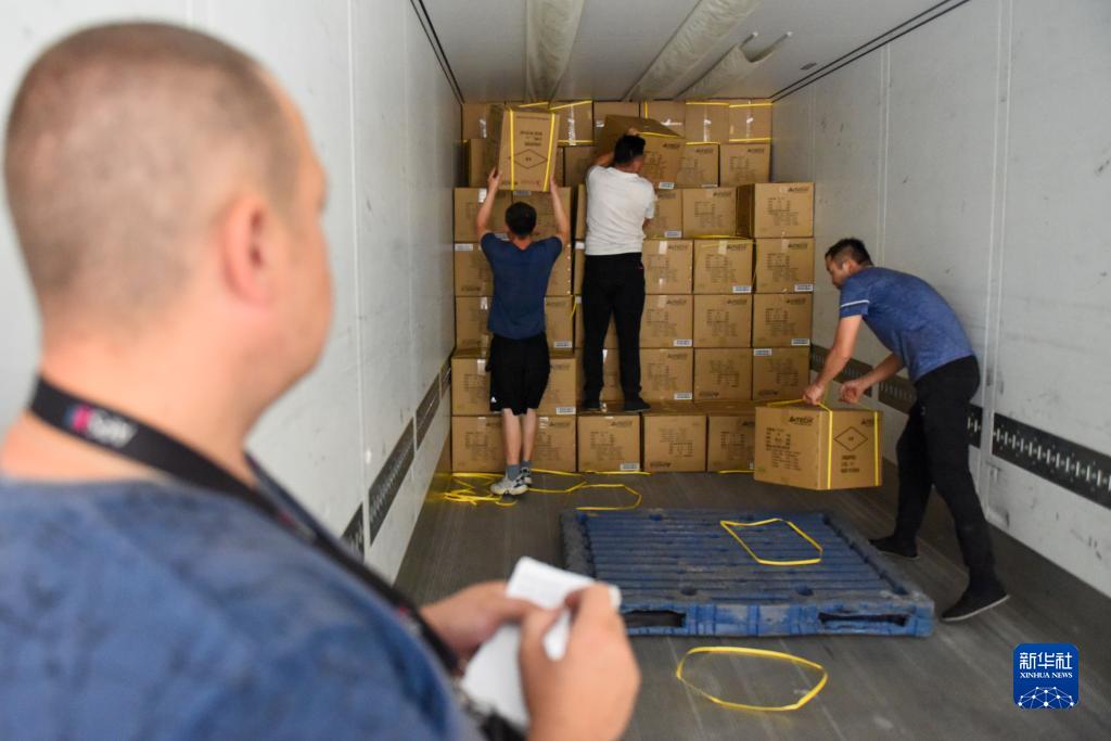 在新疆阿拉山口綜合保稅區內的跨境電子商務(wù)分揀清關(guān)中心,工作人員將貨物裝車(chē)(7月24日攝)。