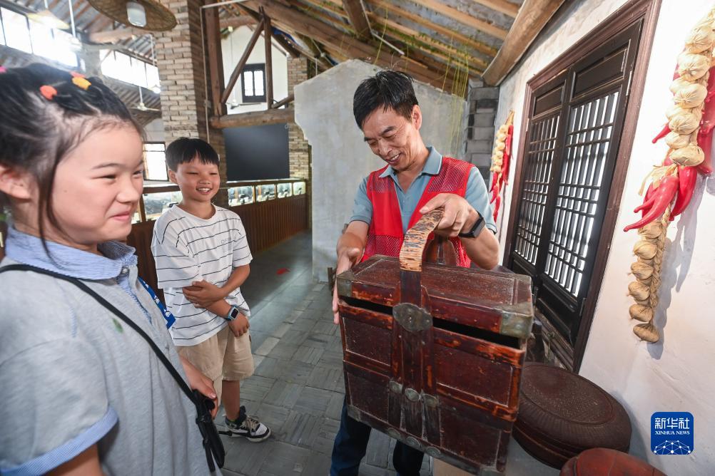 7月25日,在諸暨市馬劍鎮狀元村,志愿者給暑托班的孩子們介紹村博物館里的各類(lèi)傳統用具。