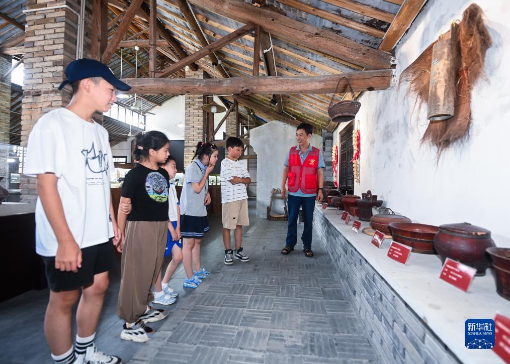 7月25日,在諸暨市馬劍鎮狀元村,志愿者給暑托班的孩子們介紹村博物館里的各類(lèi)傳統用具。