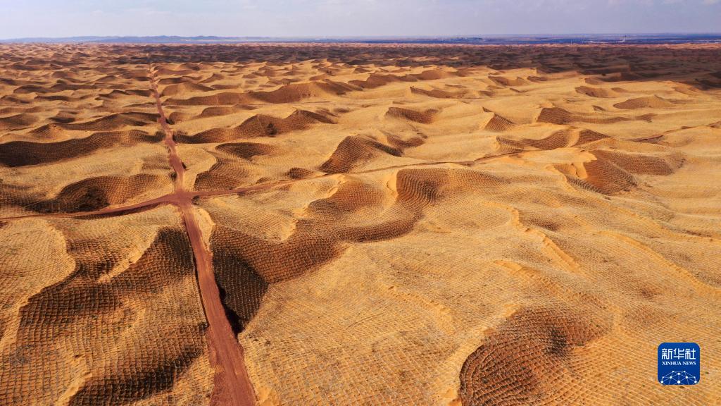 位于寧夏中衛市境內騰格里沙漠的草方格治沙區(7月19日攝,無(wú)人機照片)。寧夏中衛市是草方格沙障的起源地,該技術(shù)由中國科學(xué)院沙坡頭沙漠研究試驗站同中衛鐵路固沙林場(chǎng)職工、當地群眾經(jīng)過(guò)多年的探索和實(shí)踐總結而成。