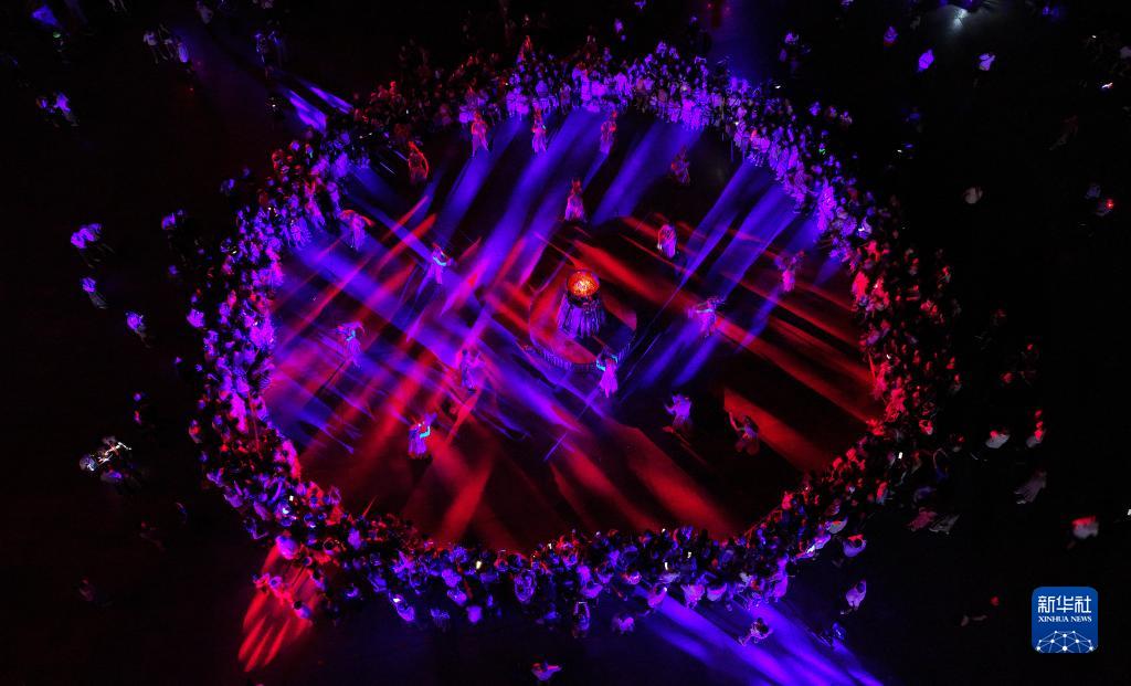 游客在陜西省漢中市留壩縣縣城內參加篝火晚會(huì )(7月22日攝,無(wú)人機照片)。