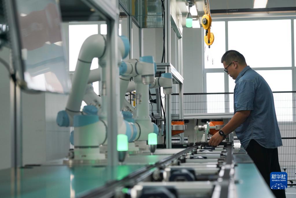 7月25日,在位于淄博市臨淄區的遨博(山東)智能機器人有限公司,工作人員在調試設備。