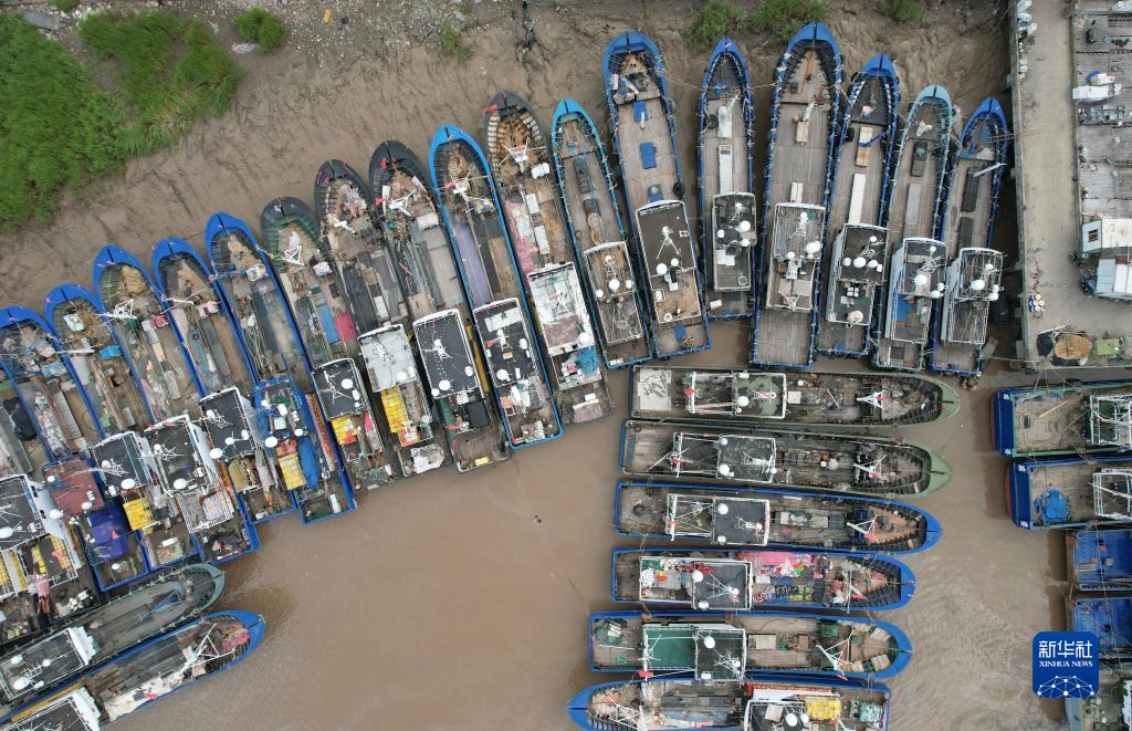 7月25日,在浙江省瑞安市東山漁港碼頭,漁船停泊在港區避風(fēng)(無(wú)人機照片)。新華社發(fā)(莊穎昶攝)