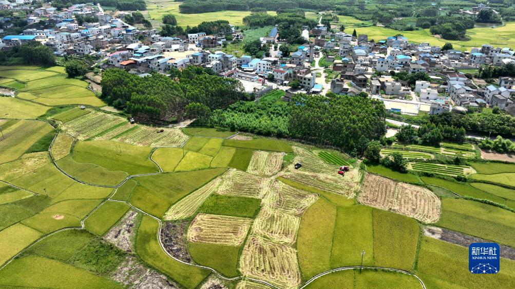 7月25日,收割機在柳州市柳江區穿山鎮林寺村的稻田中收割早稻(無(wú)人機照片)。新華社發(fā)(黎寒池 攝)