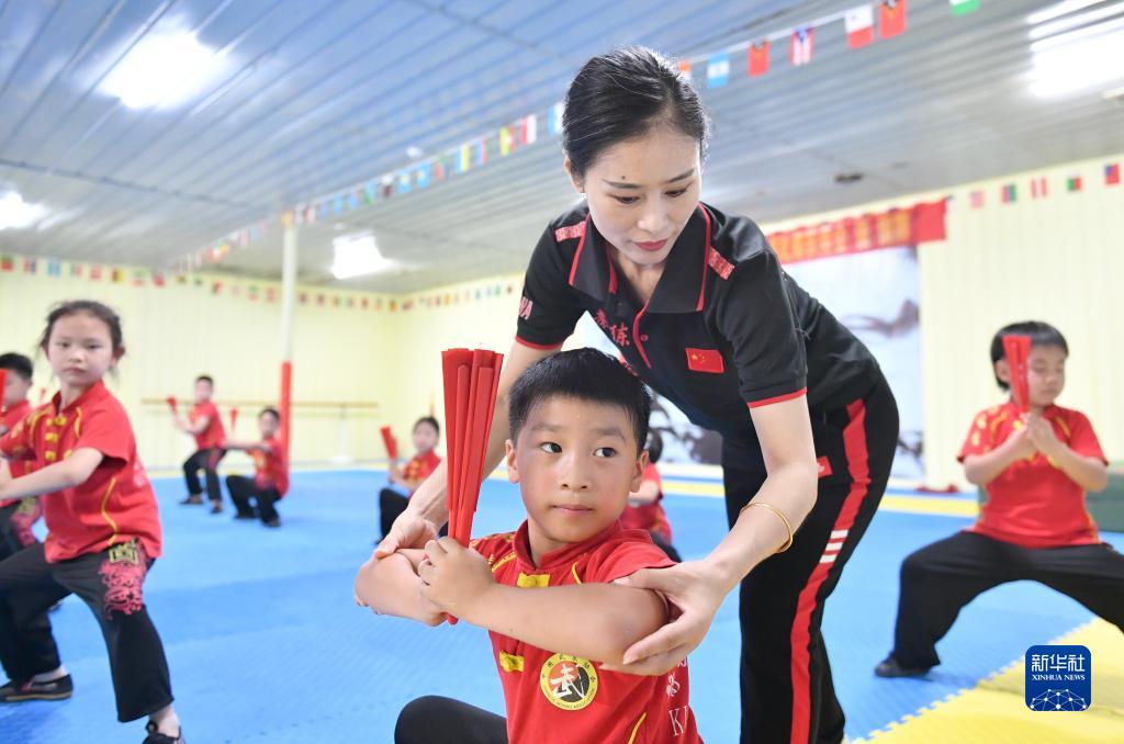 7月25日,在河南省夏邑縣靜武堂,學(xué)生在老師的指導下練習武術(shù)。新華社發(fā)(苗育才 攝)