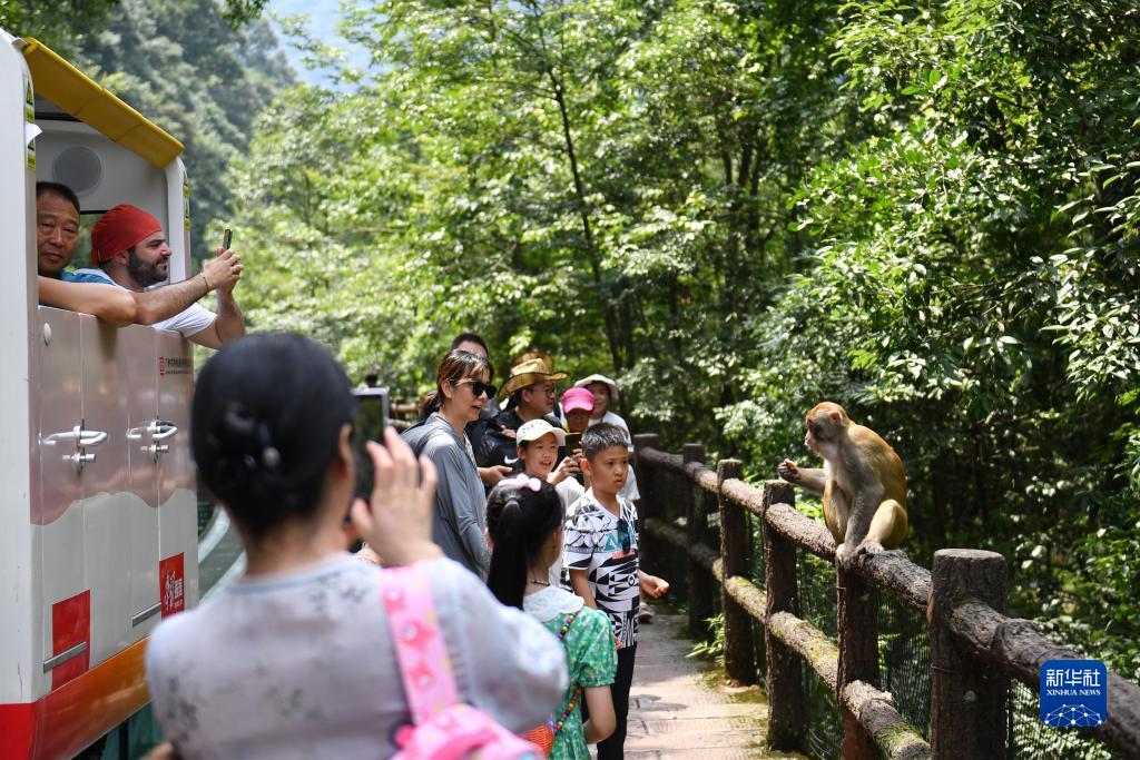 7月24日,在張家界國家森林公園十里畫(huà)廊景區,游客和獼猴互動(dòng)。