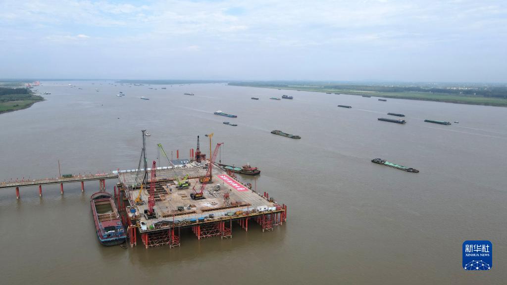 這是中鐵大橋局池州長(cháng)江公鐵大橋南岸主墩鉆孔樁施工現場(chǎng)(7月26日攝,無(wú)人機照片)。