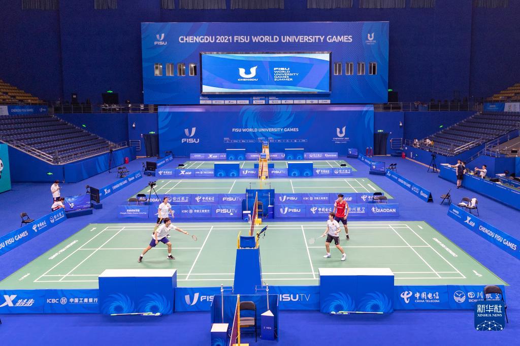 7月25日,中國代表團選手在雙流體育中心體育館進(jìn)行羽毛球賽前訓練。