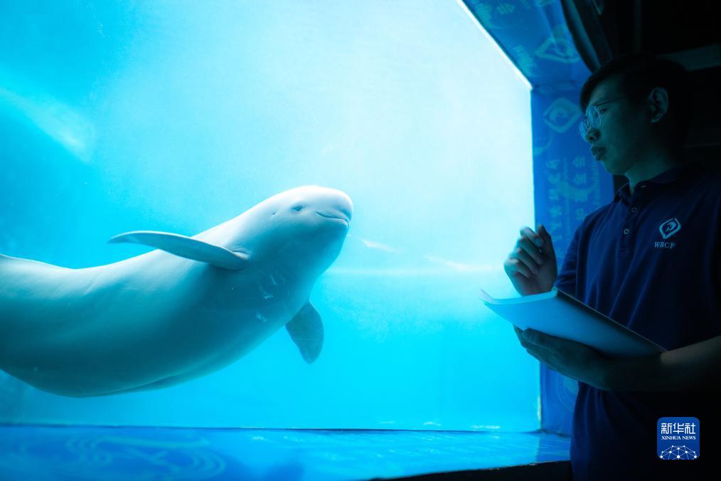 7月5日,中國科學(xué)院水生生物研究所白鱀豚館訓練員鄧正宇對一頭長(cháng)江江豚進(jìn)行觀(guān)察。