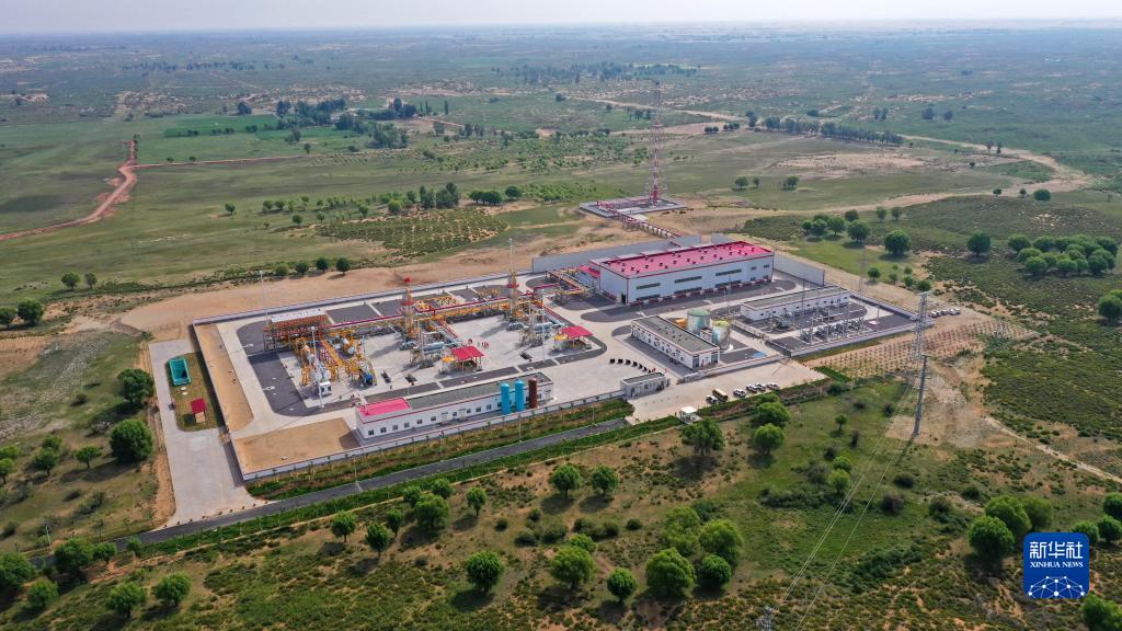 長(cháng)慶油田蘇里格氣田第五采氣廠(chǎng)蘇東儲氣庫周邊綠意盎然(7月26日攝,無(wú)人機照片)。