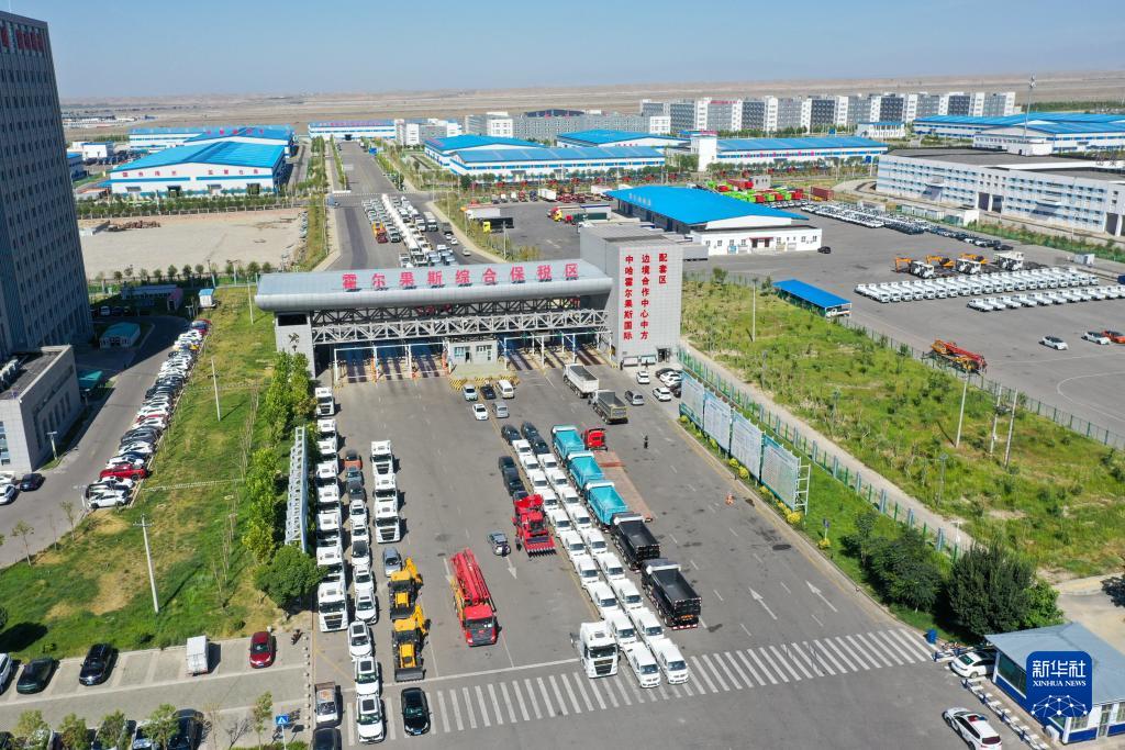 在新疆霍爾果斯綜合保稅區,國產(chǎn)商品車(chē)等待報關(guān)出境(7月26日攝,無(wú)人機照片)。