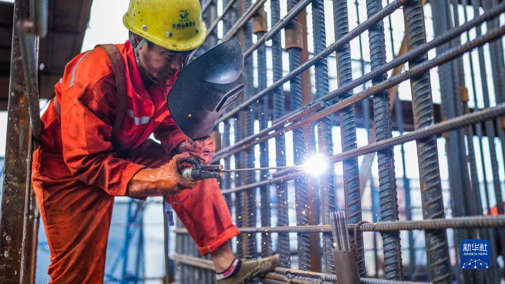 貴州公路集團工人在花江峽谷大橋5號主塔進(jìn)行施工(8月3日攝)。