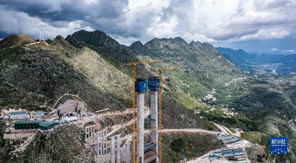 正在修建中的花江峽谷大橋5號主塔(8月2日攝,無(wú)人機照片)。