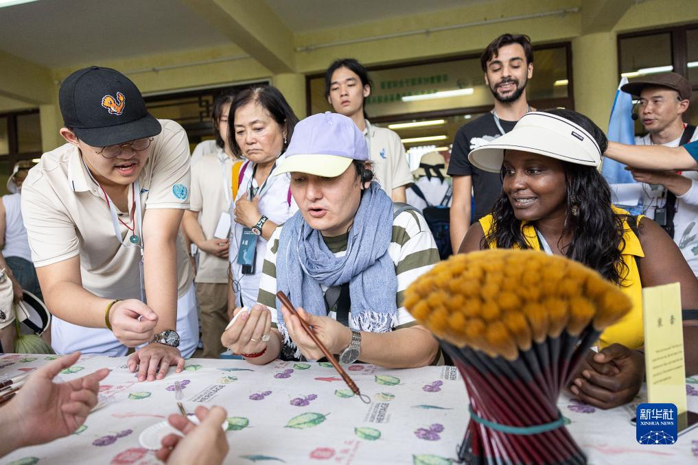 8月6日,在浙江省湖州市南潯區和孚鎮,外國友人體驗湖筆制作技藝。
