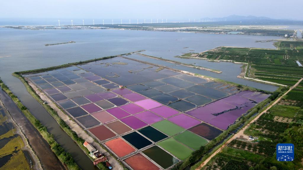 立秋將近,山東省榮成市港西鎮海邊的鹽田在晴空的映襯下呈現出五顏六色的美麗景象。