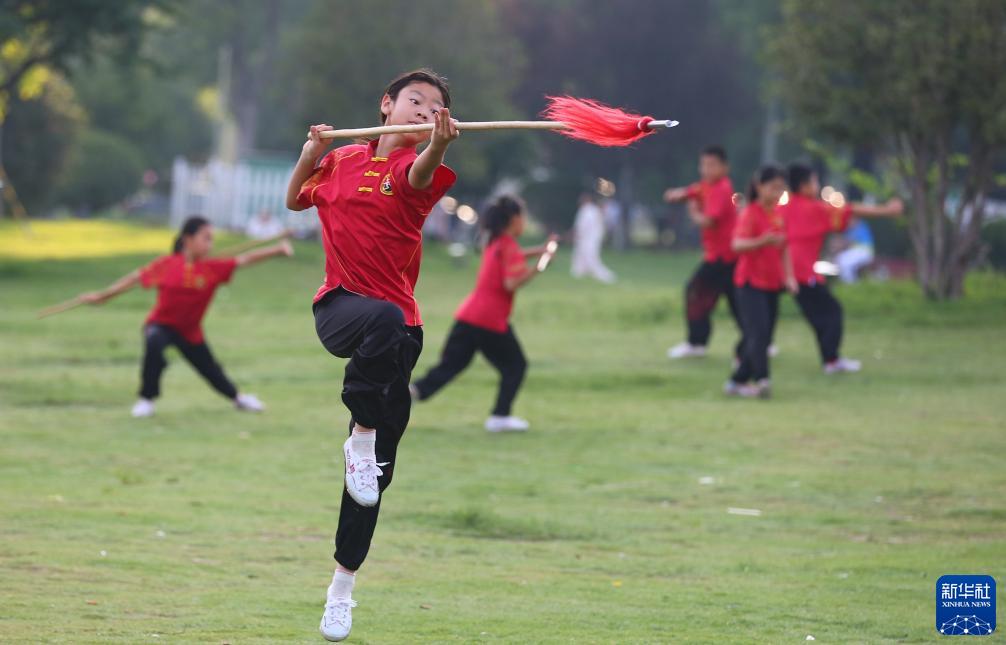 8月8日,在山東省滕州市市民公園,孩子們在練習武術(shù)。