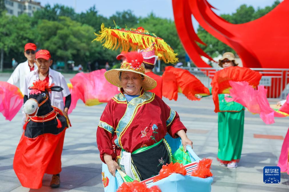 8月8日,市民在山東省青島市李滄文化公園扭秧歌。