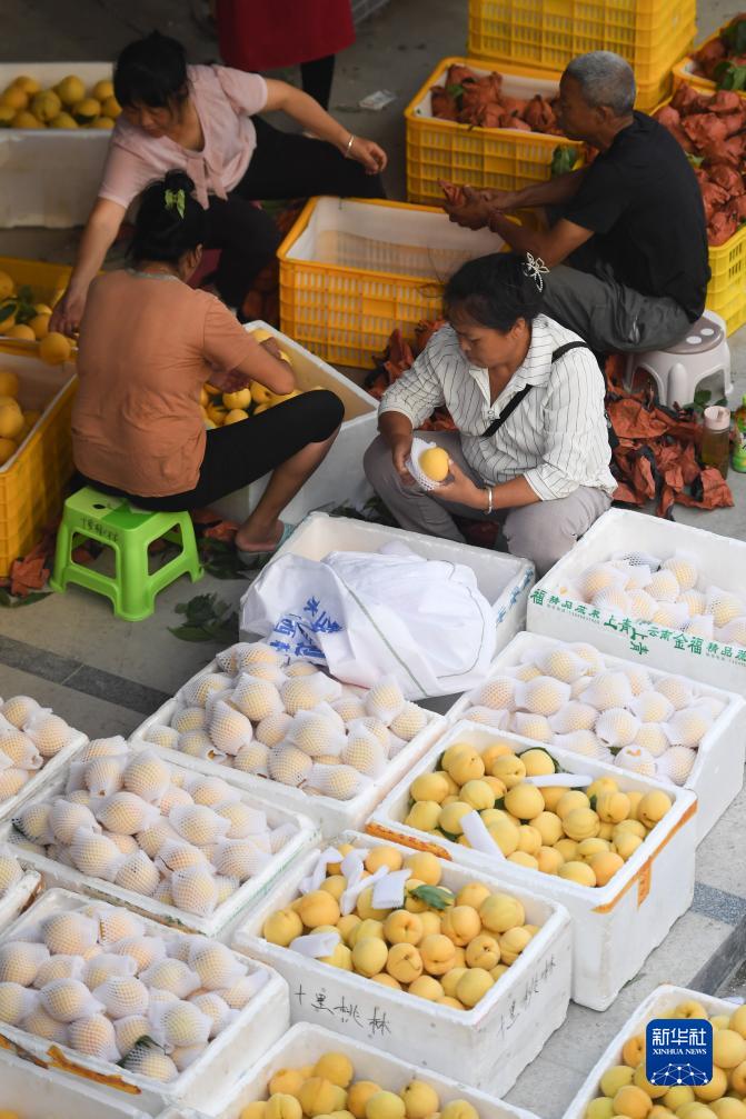 8月7日,桃農在炎陵縣水口鎮黃桃市場(chǎng)挑選黃桃并打包。