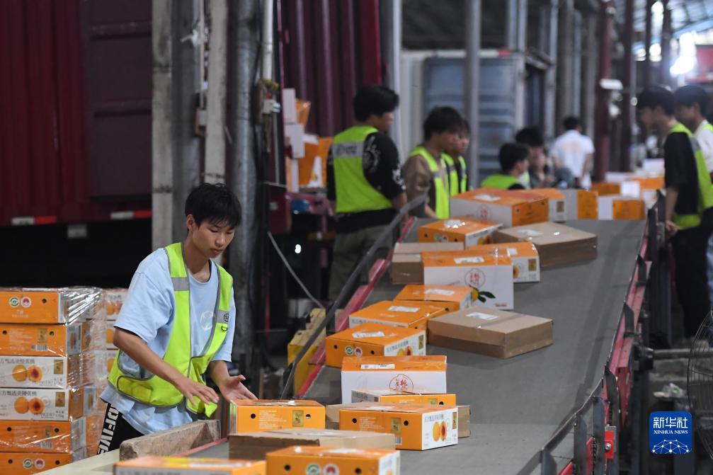 8月8日,工作人員在一家物流企業(yè)炎陵黃桃項目營(yíng)業(yè)點(diǎn)將黃桃裝車(chē)。