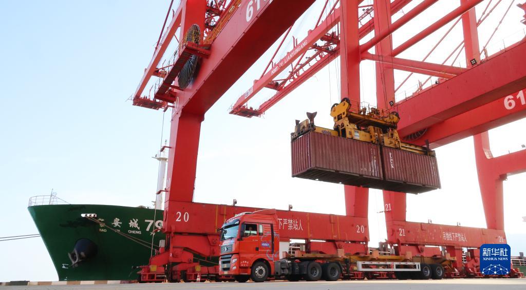 8月8日,在江蘇連云港港,貨輪在進(jìn)行裝卸作業(yè)。
