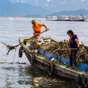 長(cháng)江進(jìn)入主汛期以來(lái),秸桿、樹(shù)枝、塑料等漂浮物隨波逐流,聚集到三峽庫區的江面上。三峽大壩上游的湖北省宜昌市秭歸縣環(huán)保部門(mén)組織清漂工人全力清漂,以減輕漂浮物對三峽樞紐運行的影響,確保三峽水庫水質(zhì)不受污染,保障船舶航行安全。