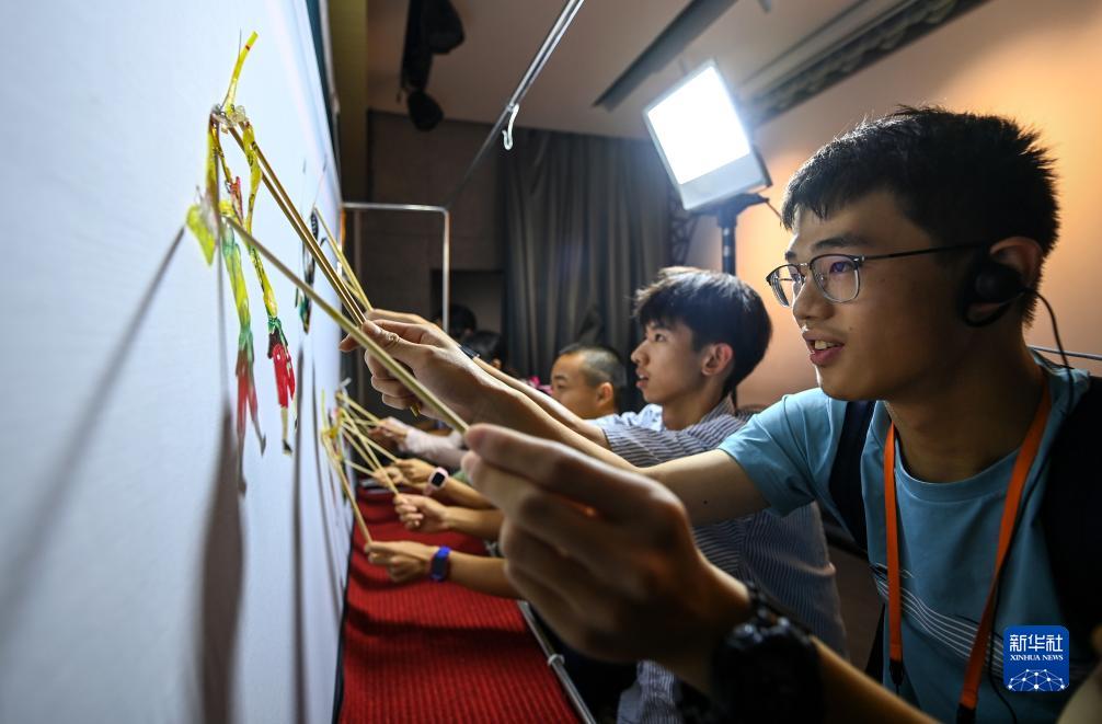 暑期研學(xué)的學(xué)生在中國秦腔藝術(shù)博物館里體驗皮影戲演出(8月8日攝)。