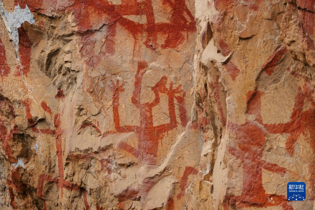 這是巖畫(huà)局部,一個(gè)戴著(zhù)漂亮羽飾的人像(8月8日攝)。