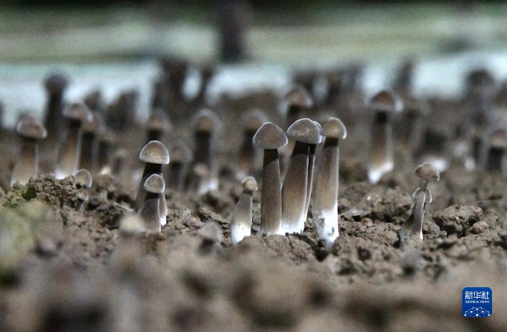 8月10日在山東省菏澤市定陶區一處食用菌種植基地內拍攝的黑皮雞樅菌。