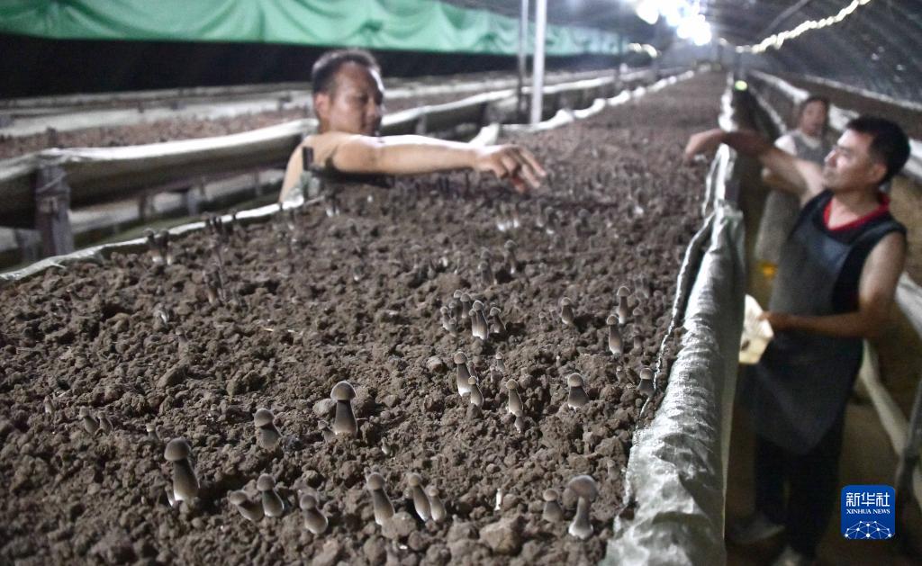 8月10日,在山東省菏澤市定陶區一處食用菌種植基地,工作人員在收獲成熟的黑皮雞樅菌。