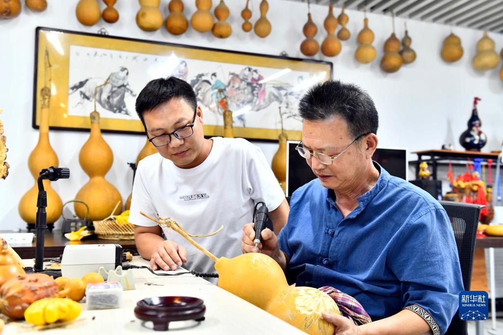 8月10日,在棗莊市薛城區葫蘆刻繪非遺工坊,“周氏葫蘆刻繪”非遺傳承人周建華(右)邊創(chuàng )作邊傳授徒弟刻繪技法。