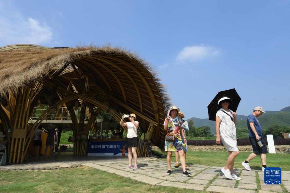 8月11日,游客在安吉余村參觀(guān)用當地盛產(chǎn)的竹材料建造的建筑。