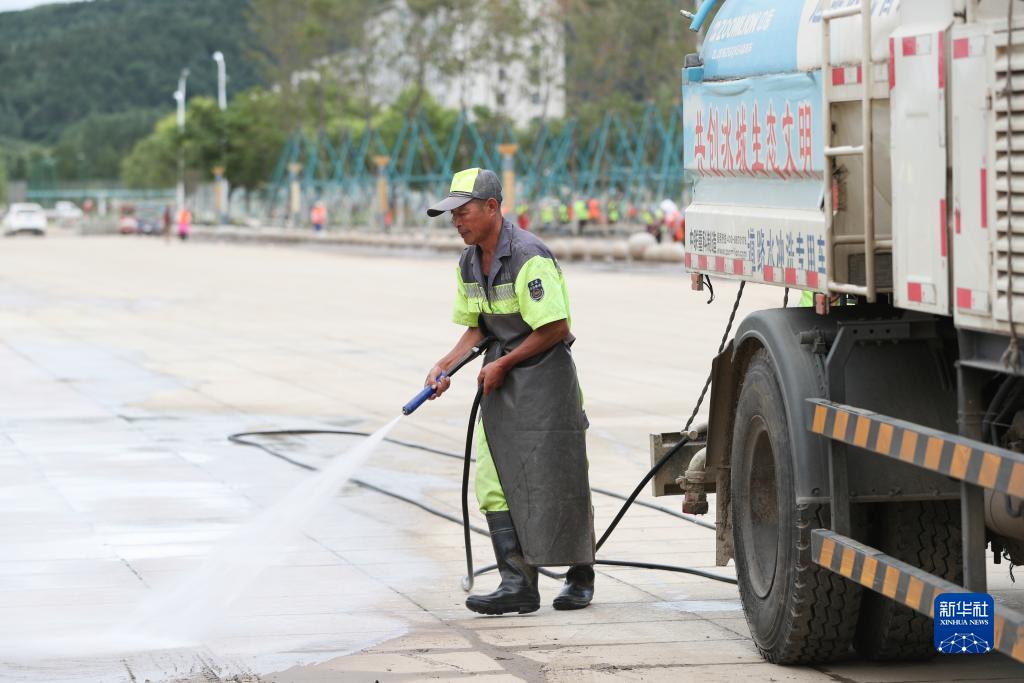 8月11日,在黑龍江省尚志市一處街道上,環(huán)衛工人在沖洗街道。